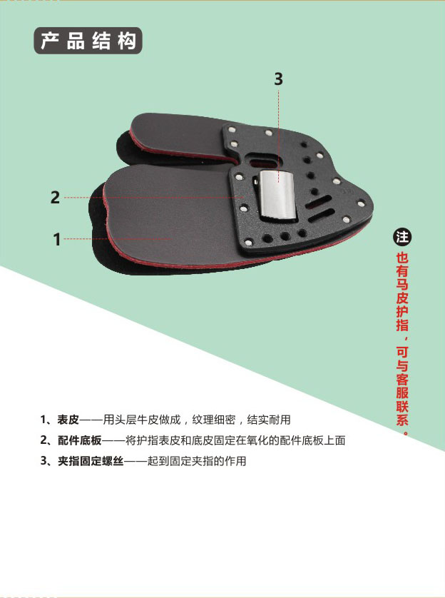 骇客护指底板及托腮搭指由铝合金根据人体工学原因精溢制造而成 。其不同型号大小的设计与用户的掌型紧密贴合,表皮及面皮由十几颗不锈钢螺丝固定在铝合金底板上。色彩艳丽协调,品质高贵。