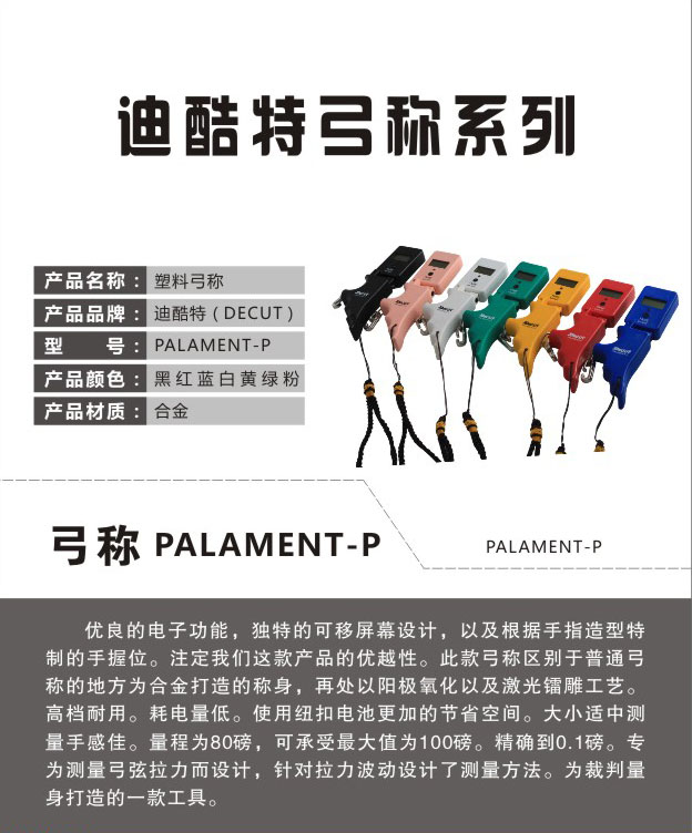 优良的电子功能,独特的可移屏幕设计,以及根据手指造型特制的手握位。注定我们这款产品的优越性。此款弓称区别于普通弓称的地方为合金打造的称身,再处以阳极氧化以及激光镭雕工艺。高档耐用。耗电量低。使用纽扣电池更加的节省空间。大小适中测量手感佳。量程为80磅,可承受最大值为100磅。精确到0.1磅。专为测量弓弦拉力而设计,针对拉力波动设计了测量方法。为裁判量身打造的一款工具。