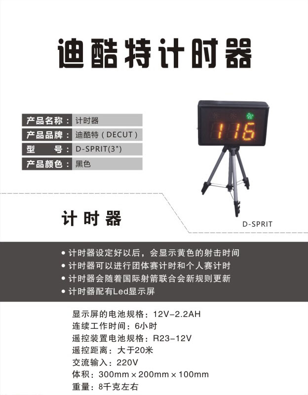 计时器设定好以后,会显示黄色的射击时间。可以进行团体赛计时和个人赛计时。会随着国际射箭联合会新规则更新。配有Led显示屏。