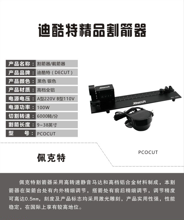 佩克特割箭器采用高转速静音马达和高档铝合金材料制成,本割箭器在架箭台处有内外精细调节,搭箭处有前后精细调节,调节精度可高达0.5mm,刻度及产品标志均采用激光雕刻,产品实用性强,性能稳定,在国际上享有较高地位。